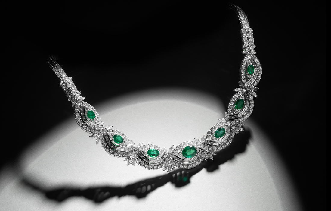 Behold the "Jewel of the Crown"—an extraordinary necklace that transcends time, crafted for those who rule not just kingdoms, but generations. At its heart rests a majestic above 100ct emerald, cut with unparalleled precision, cradled in a royal crown-inspired base sculpted like the crescent moon. Every curve of this masterpiece is lavished with glittering diamond baguettes, their brilliance orchestrated to dance under moonlight, as if the stars glisten in admiration of its grandeur.